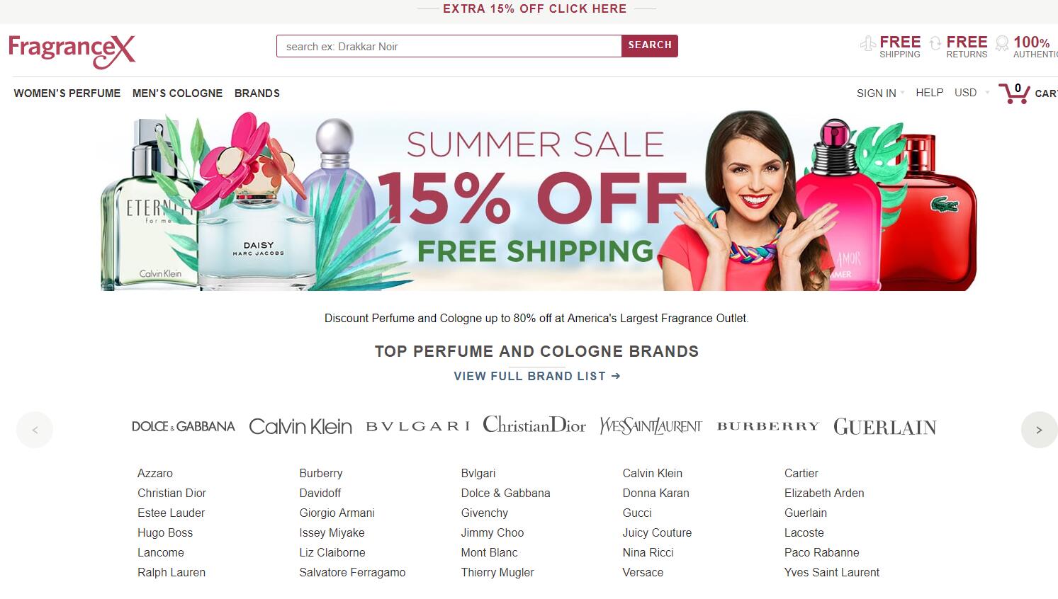网站简介:FragranceX.com是来自美国的一家大型香水零售商,它拥有众多的知名品牌香水,并大多以折扣价出售,销售Gucci古驰、Burberry博柏利、Calvin Klein卡文克莱、Christian Dior迪奥等超过9,500个香水品牌,甚至还包括一些已经停产了的香水产品。所有的香水都是100%正宗的设计师品牌,不卖仿冒品或仿制品。是网上购买香水的好地方。它也是美国最大的折扣香水出口商,结算货币包括美元、英镑、欧元等。FragranceX.com除提供香水外,还提供大量美肤及彩妆品。
