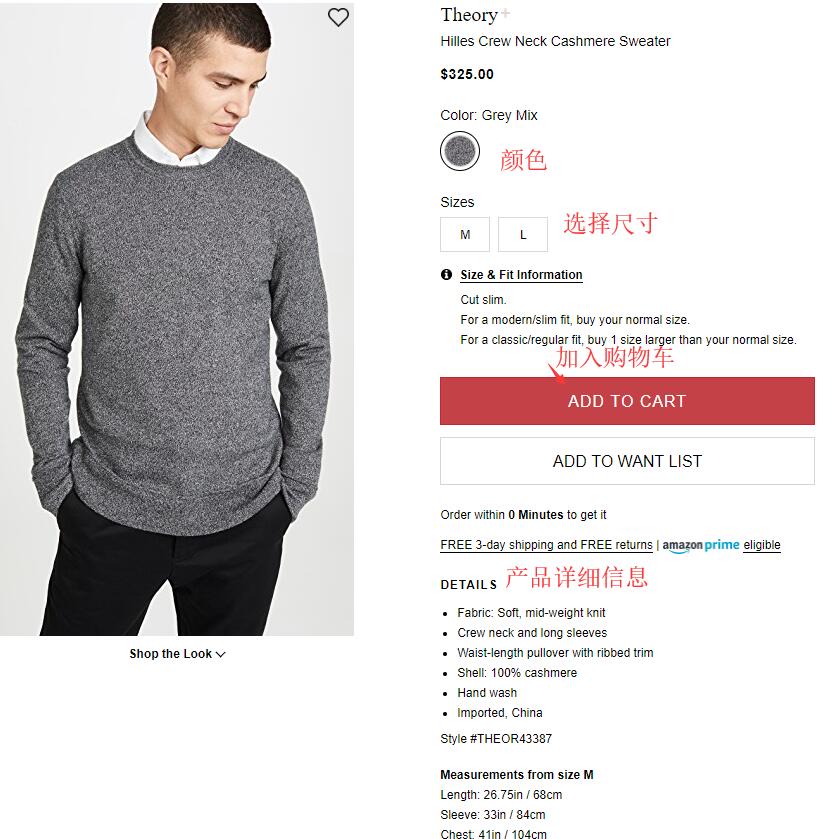 2)比如THEORY的这件灰色羊毛衫,选择好你适合自己的尺寸,然后加入购物车即可,和我们淘宝上购物是一样一样的~!产品右侧还有这件产品的具体描述,用料、产地、模特身高信息等,方便你了解。