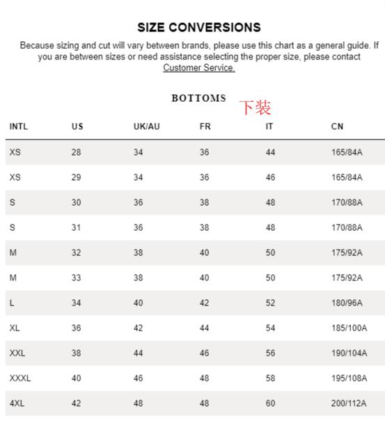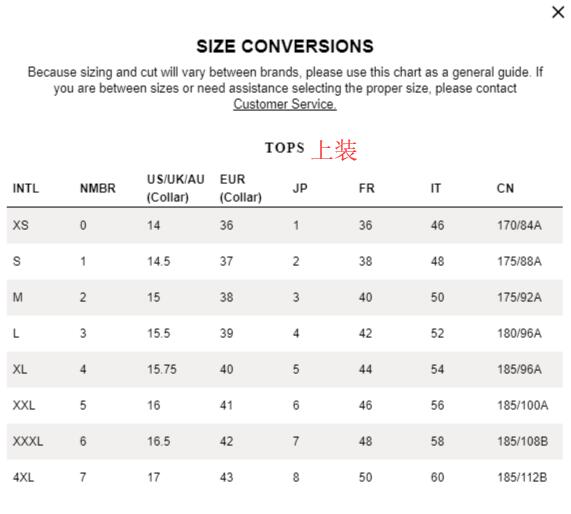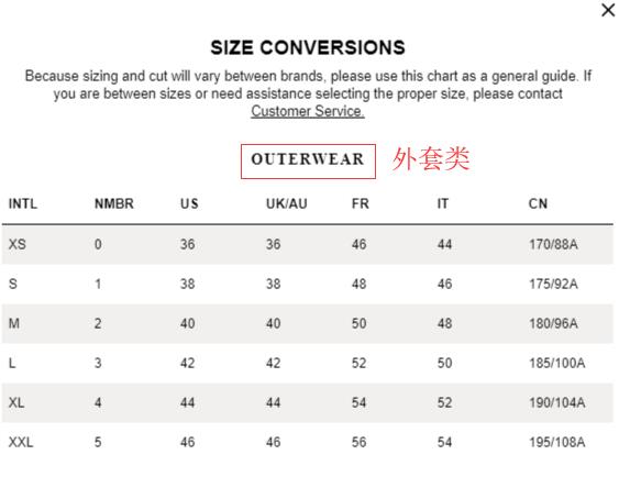 在产品右侧点开Size & Fit, 再点击Size Conversions就可以看到相应类别的尺码表了~!