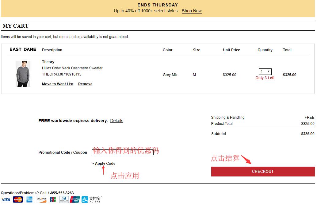 1)进入购物车,输入你注册得到的85折优惠码,然后点击结算