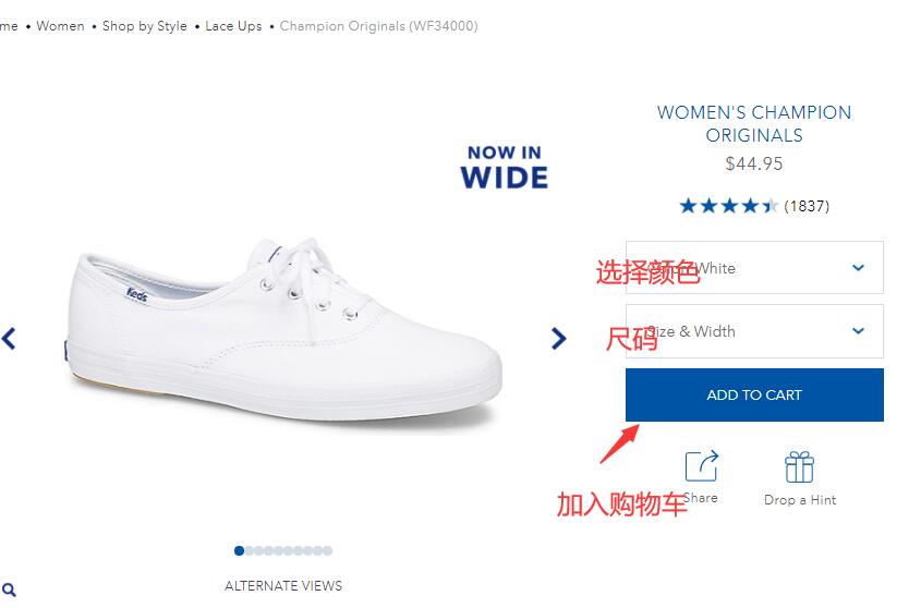 挑选您想海淘的产品,比如以这双女士CHAMPION ORIGINALS帆布鞋为例,加入购物车