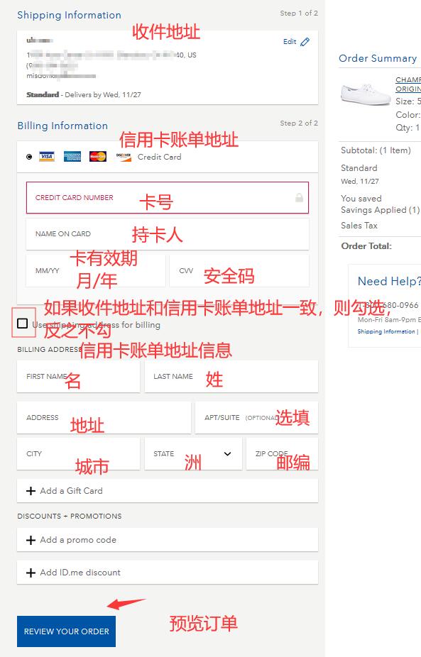 步骤3:结账(收件地址信息、信用卡账单地址信息填写、选择付款方式)