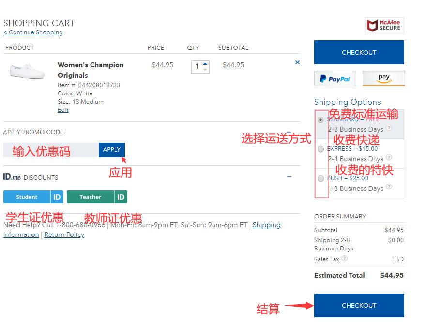 1)在购物车中输入优惠码; 选择你想要的快递方式。如果你有学生卡或者教师证你还可以得到额外的优惠哦~!
