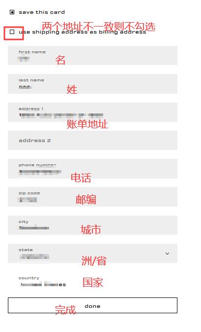 4. 若你的信用卡账单地址(Billing)和收件地址(Shipping)不一样,那么则需要重新填写信用卡账单地址, 如图