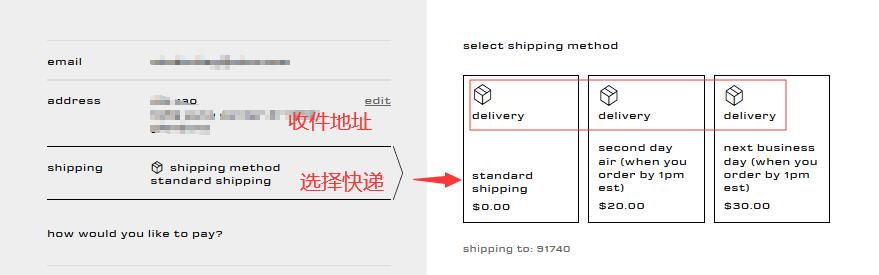 1. 确认收件地址&选择你要使用的快递方式,有默认的美国境内免邮,和收费的2个工作日和下个工作日送达
