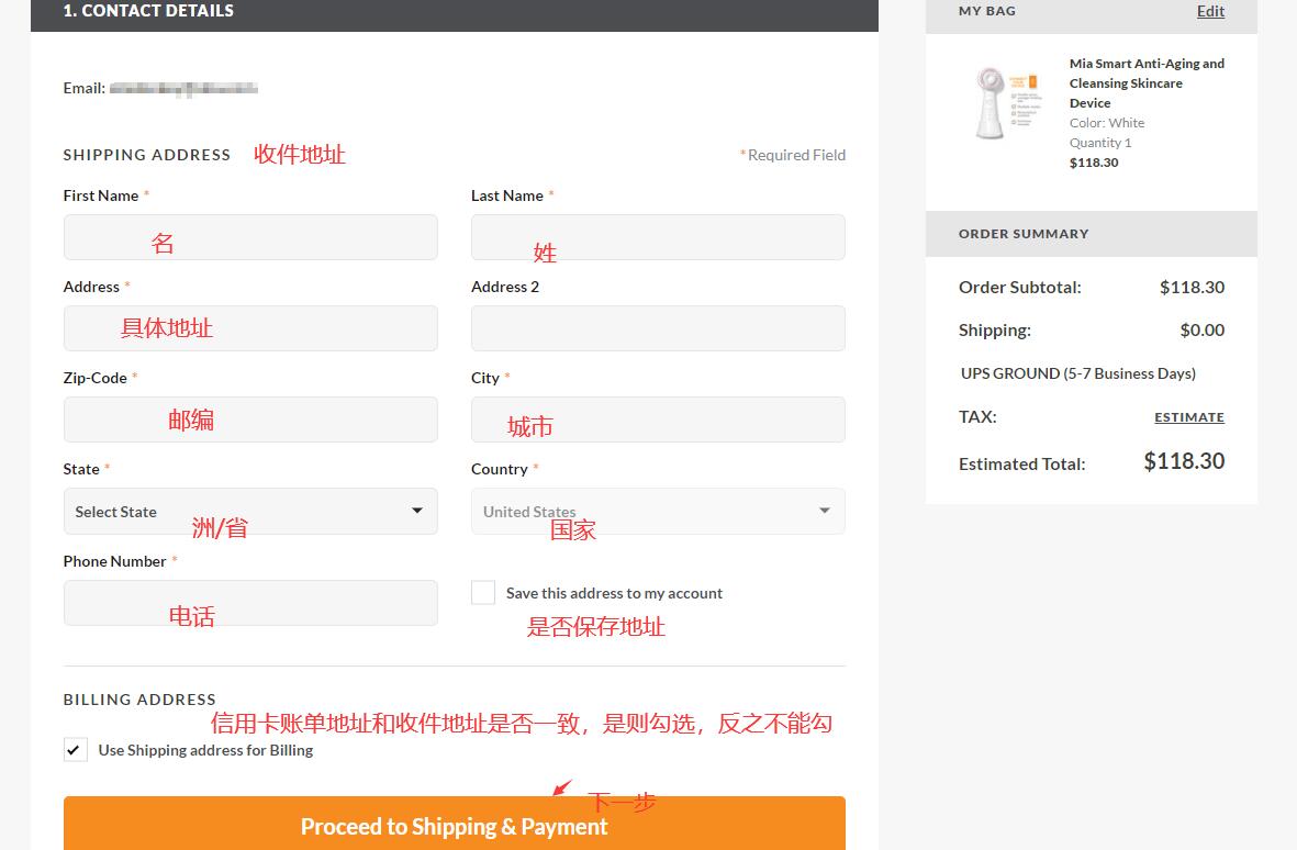 4)填入转运地址:选择好后,转运地址上会有详细的英语信息,在海淘商家的结账环节(Checkout),只需要一词不差地把这些信息填写(复制粘贴)到商家的“Shipping Address”上即可(注意是填在Shipping Address这一栏上,而不是Billing Address,后者是填信用卡账单地址的)。