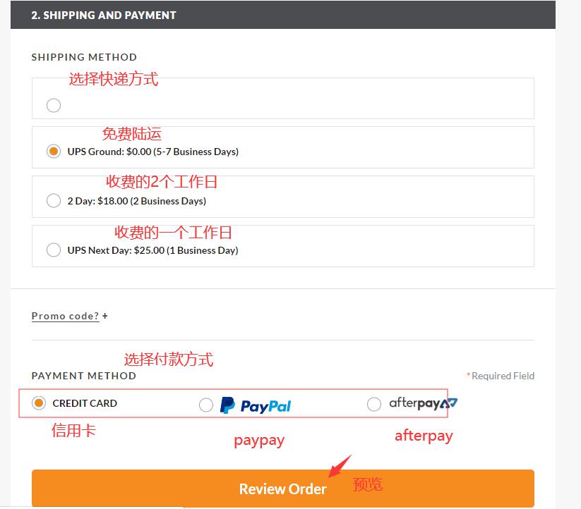 3. 选择快递方式和支付方式,你想使用哪种就选择哪一种。(本文以信用卡支付为例)