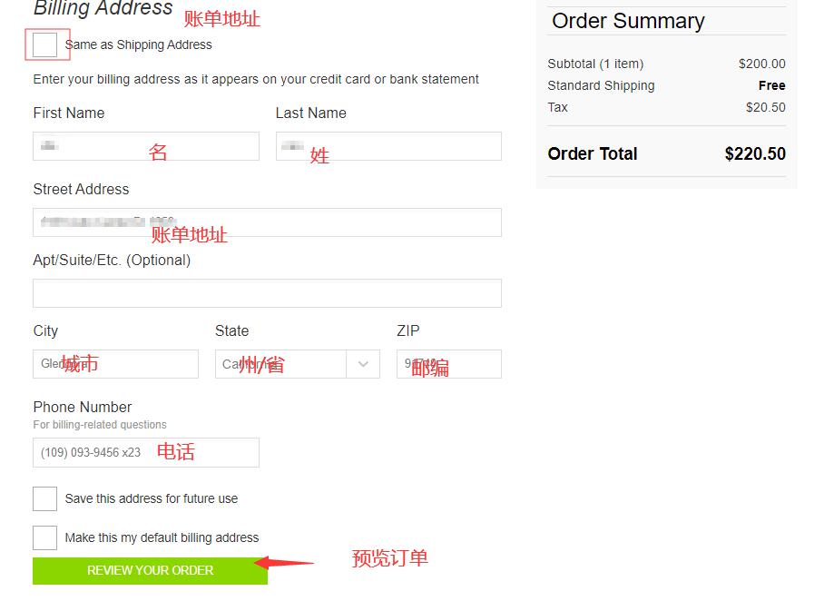(若信用卡账单地址(Billing)和收件地址(Shipping)不一致,则不勾选Same as shipping address, 然后重新填写账单地址信息)