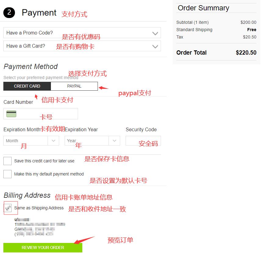 步骤3:结账( 选择快速、收件地址信息、信用卡账单地址信息填写、选择付款方式)