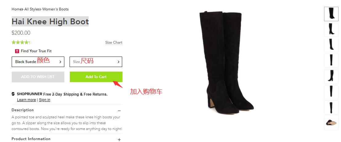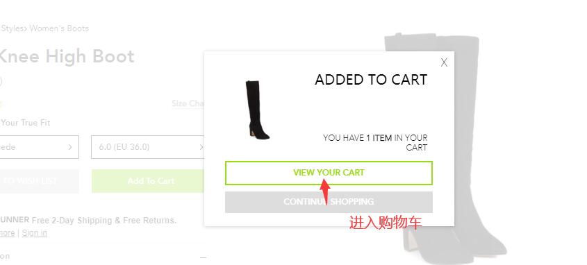 挑选您想海淘的产品,以这双女士长筒靴为例,加入购物车