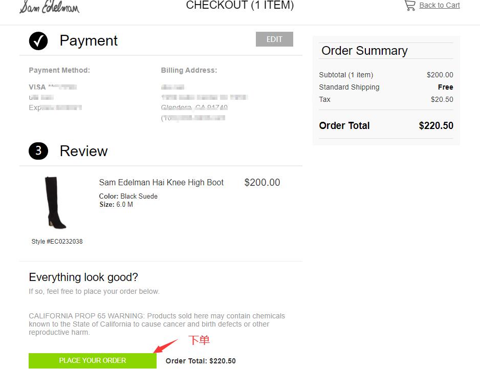 最后点击下单就可以啦!当成功下单后,你的注册邮箱里会收到一封Sam Edelman的订单确认邮件,此后,您只需等待半月左右,你心爱的宝贝就会到达您手中啦,有木有很简单~~!