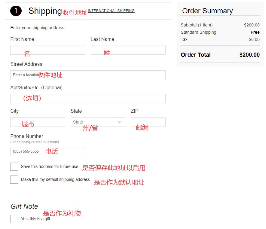 4)填入转运地址:选择好后,转运地址上会有详细的英语信息,在海淘商家的结账环节(Checkout),只需要一词不差地把这些信息填写(复制粘贴)到商家的“Shipping Address”上即可(注意是填在Shipping Address这一栏上,而不是Billing Address,后者是填信用卡账单地址的)。