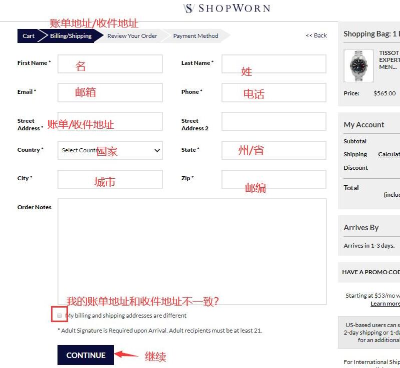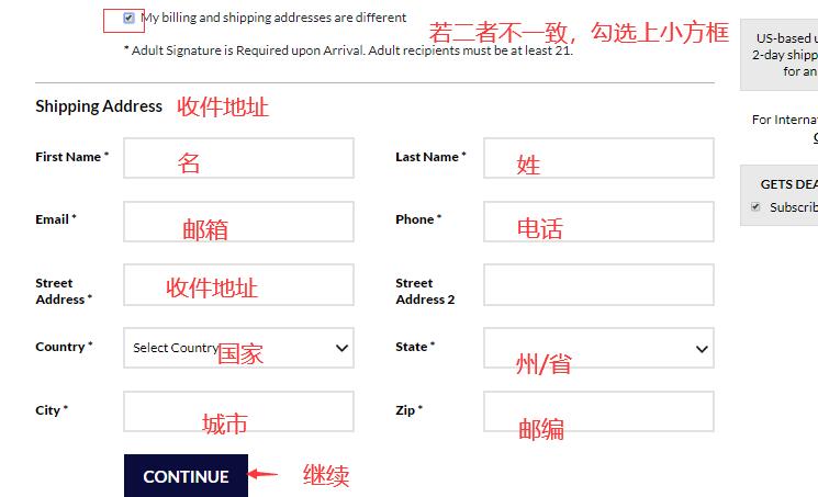 2) 若收件地址和账单地址不一样的话,就勾选不一样,然后重新填写收件地址