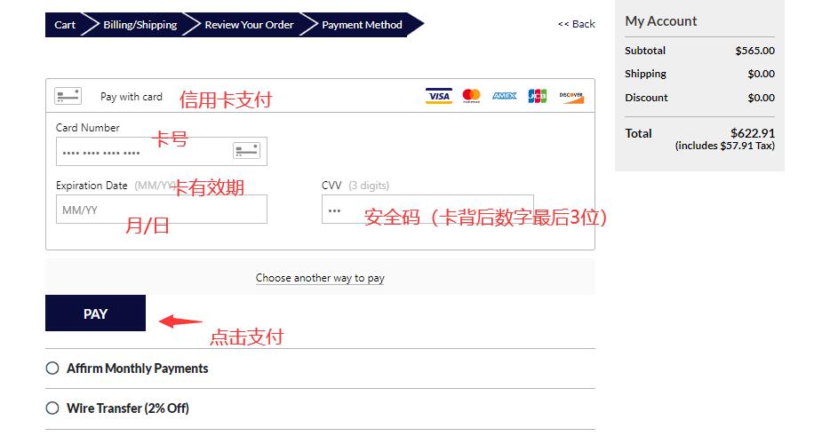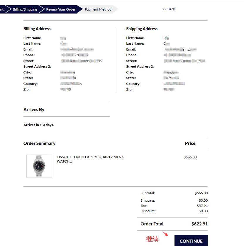步骤3:结账( 收件地址信息、信用卡账单地址信息填写、选择快速、选择付款方式)