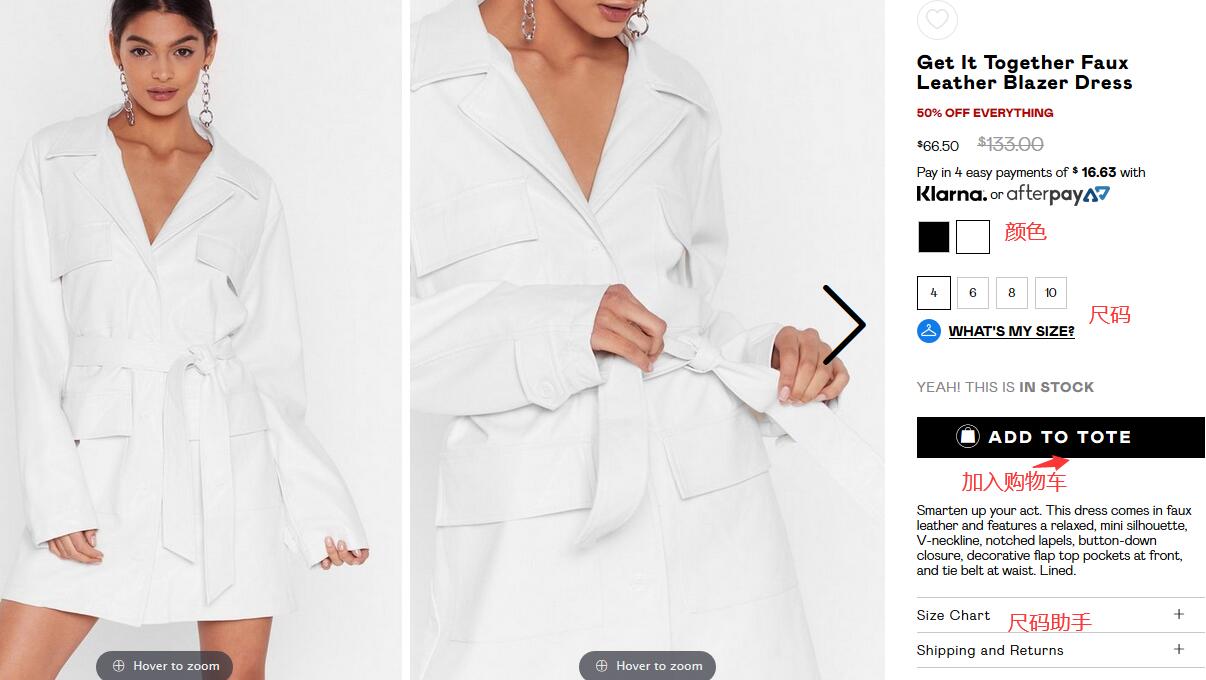 注册完后就可进入商家页面买买买了~~~把你想买的宝贝都加入购物车里,以这件连衣裙为例: