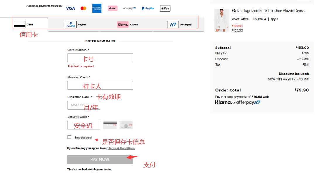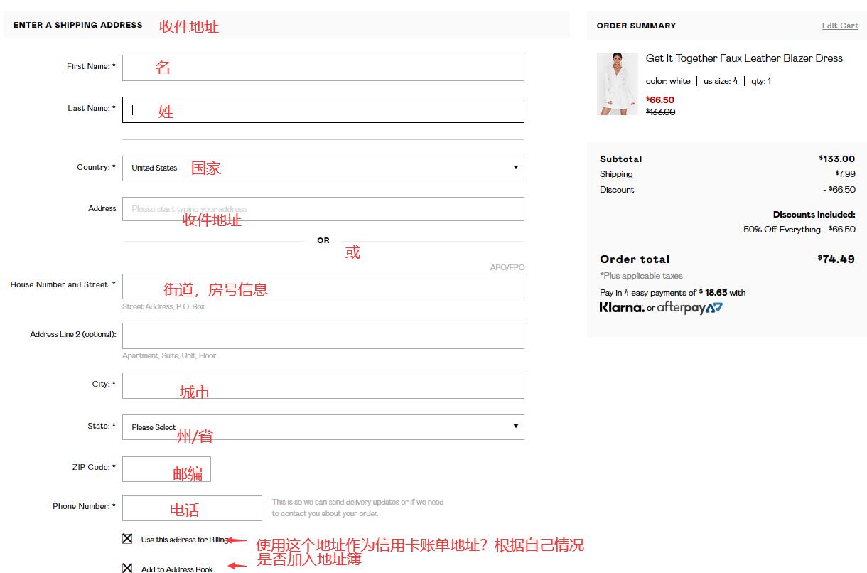 步骤3:结账( 收件地址信息、信用卡账单地址信息填写、选择快速、选择付款方式)