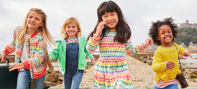 Joules来自英国的中高端品牌。他家的雨靴雨衣等都是全球公认的好物,许多明星博主都是他的粉丝。童装以纯棉织物为主,质地优良,手感舒适,主打惬意田园风,非常清新可爱,特别是女宝宝的印花裙真的好看,艺术设计感浓烈。男宝宝的衣服印着各种各样的卡通图案,童趣十足。随便买一件宝贝都会很开心的哦!