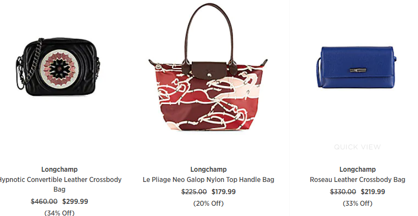 【网站简介】Saks Off 5th是Saks 5th Avenue的折价店,Saks 5th Avenue萨克斯第五大道精品百货店,世界顶级百货公司之一,提供众多顶尖品牌售卖,以高品质的服饰及服务为纽约市民所喜爱。Saks Off 5th常年都会有一些大品牌打折。凭借其优质的商品,低廉的价格,赢得了众多消费者的喜爱。Saks Off 5th网站上Longchamp包包款式多样,而且都是折扣价出售,低至77折!喜欢的小伙伴别错过~!