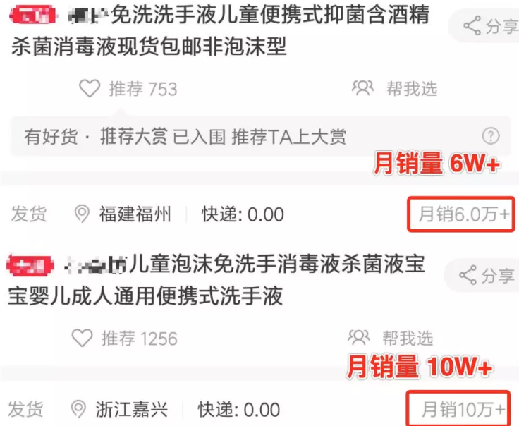 疫情之下,也催生了无尽的商机,各种洗手液纷纷开始冠以「战胜疫情,消毒杀菌」的名目,大肆宣传,销售量自然也是一路上涨。在某电商网站上以「免洗洗手液」为关键词搜索,大部分产品月销量相比往常都翻了几倍,甚至不少产品月销量达到了 10W+。