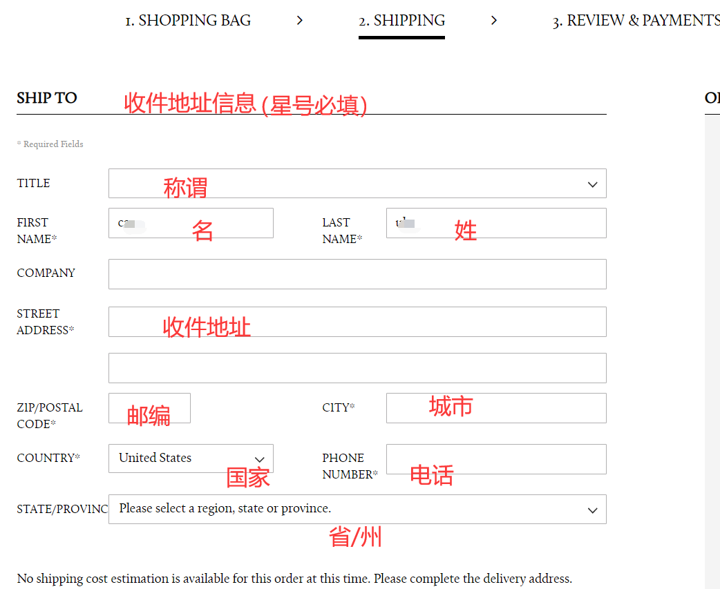 4)填入转运地址:选择好后,转运地址上会有详细的英语信息,在海淘商家的结账环节(Checkout),只需要一词不差地把这些信息填写(复制粘贴)到商家的“Shipping Address”上即可(注意是填在Shipping Address这一栏上,而不是Billing Address,后者是填信用卡账单地址的)。