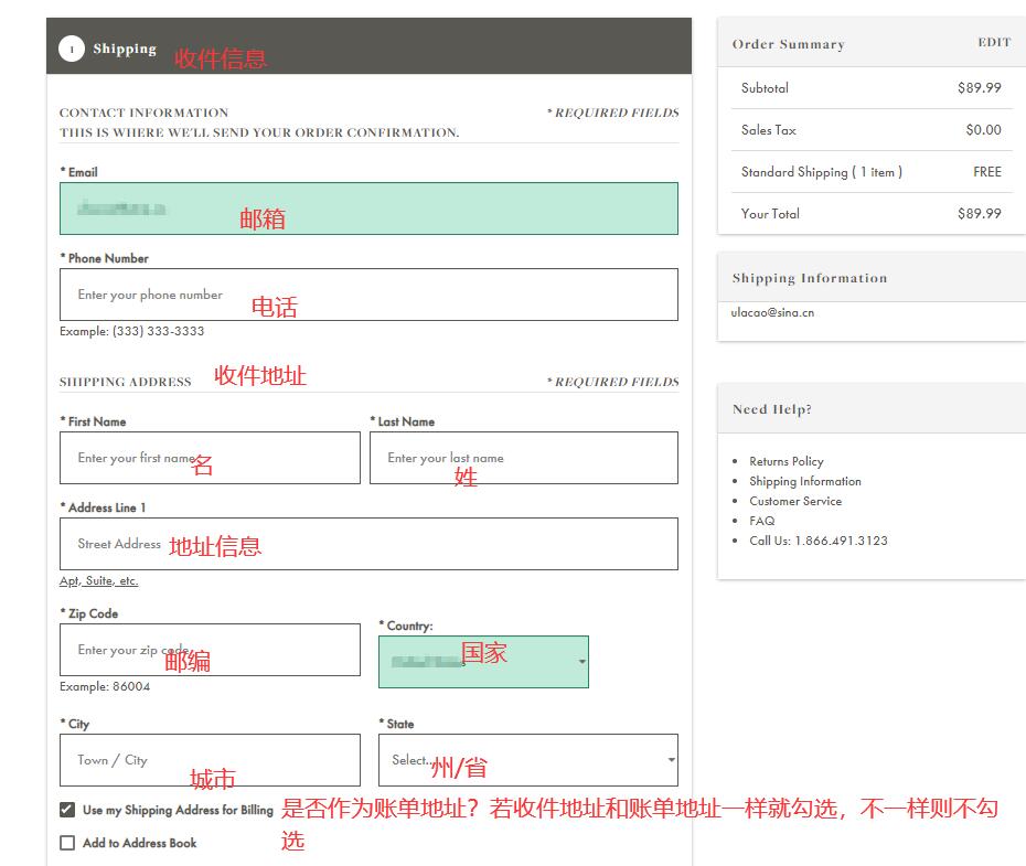4)填入转运地址:选择好后,转运地址上会有详细的英语信息,在海淘商家的结账环节(Checkout),只需要一词不差地把这些信息填写(复制粘贴)到商家的“Shipping Address”上即可(注意是填在Shipping Address这一栏上,而不是Billing Address,后者是填信用卡账单地址的)。