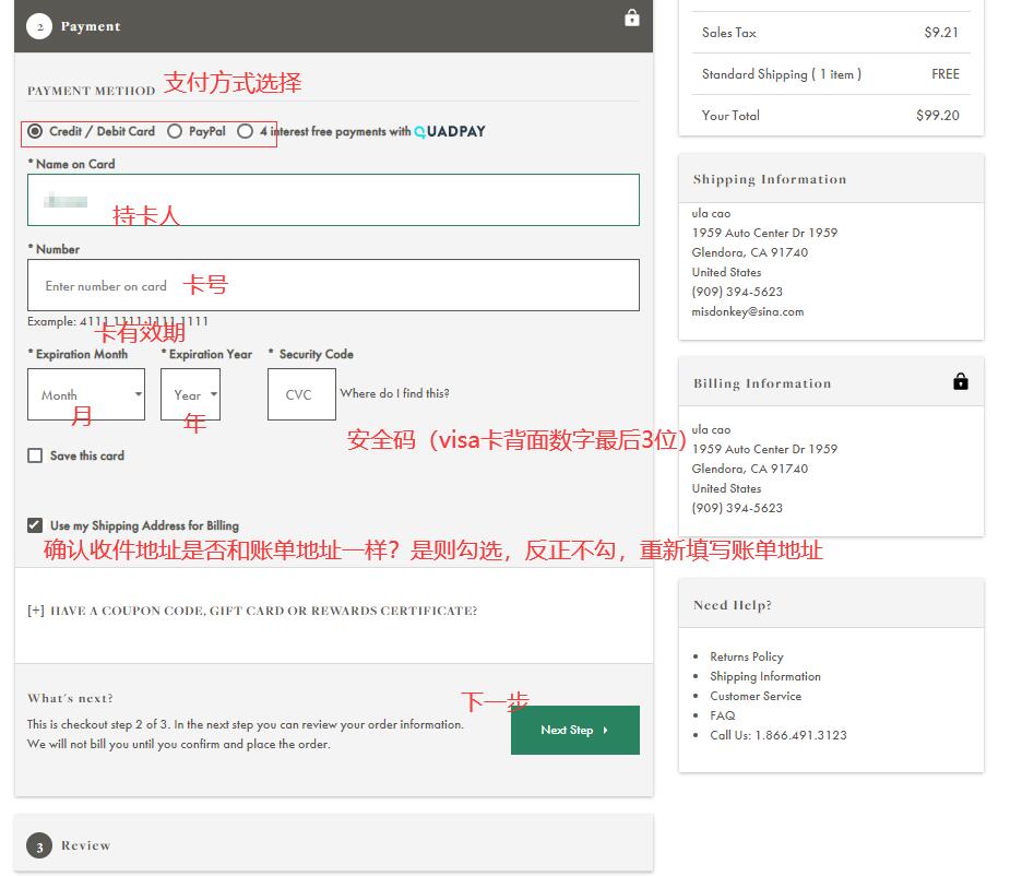 步骤3:结账( 选择快速、收件地址信息、信用卡账单地址信息填写、选择付款方式)