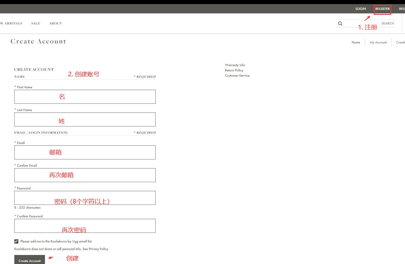 步骤1:打开Koolaburra美国官网并注册账号
