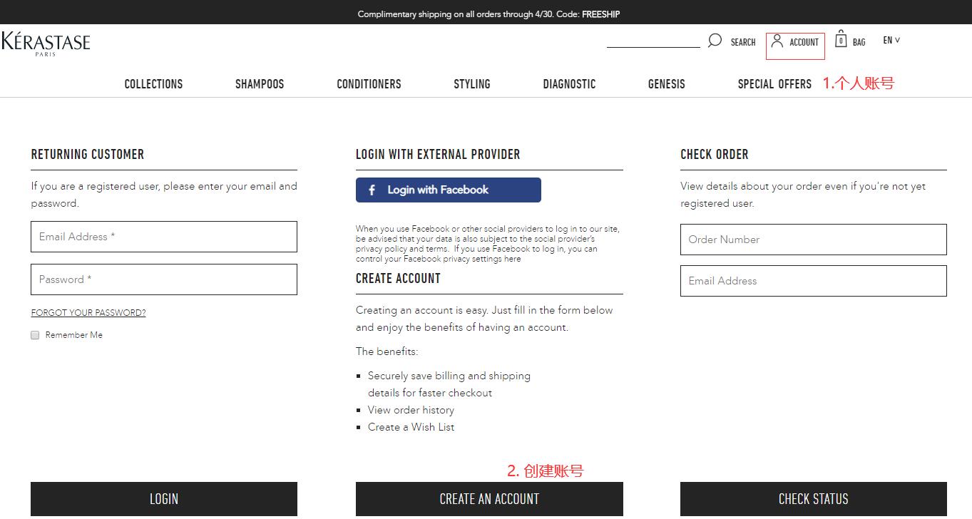 步骤1:打开卡诗Kerastase加拿大官网官网并注册账号