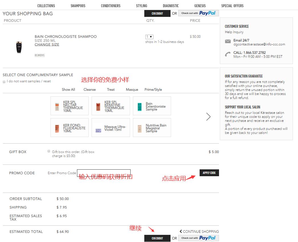 3)选择你想要的免费小样&使用优惠码获得折扣