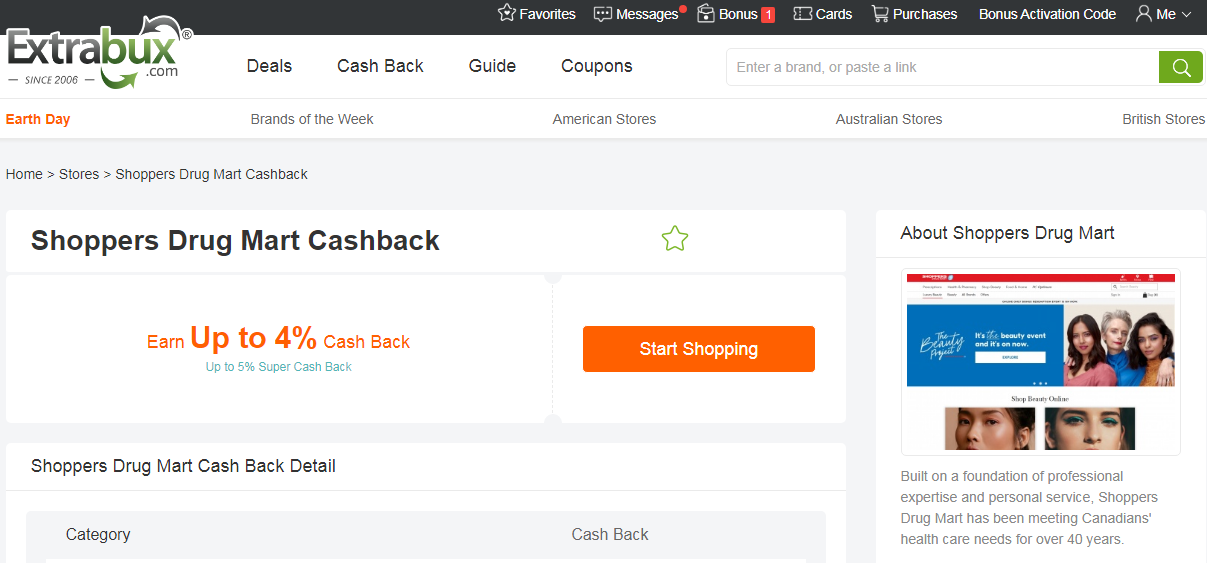 2)注册Extrabux返利网(点击):注册后,在Extrabux找到你要海淘的商家,通过Extrabux上的链接到达海淘商家页面,这样海淘成功后可以获得最高30%现金返利。比如,在Shoppers Drug Mart加拿大官网海淘就可以拿到消费金额4%-5%的返现。