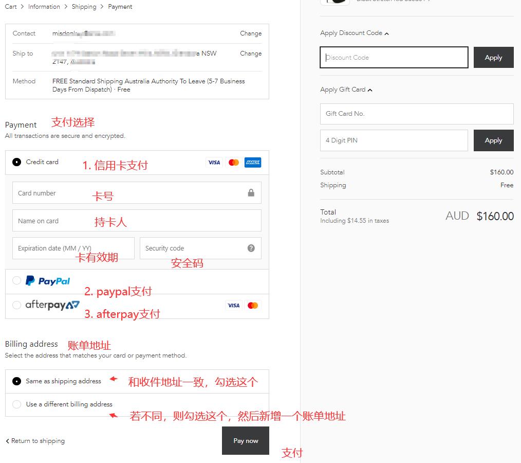 步骤3:结账( 选择快速、收件地址信息、信用卡账单地址信息填写、选择付款方式)