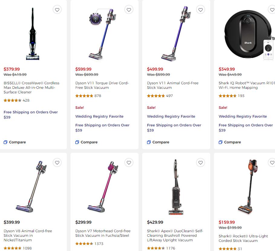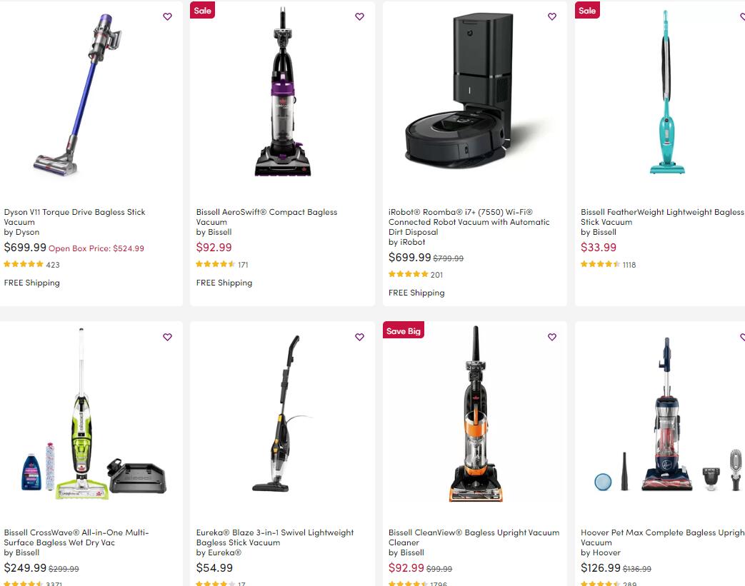【网站简介】Wayfair是美国最大的家居电商购物平台,被《福布斯》杂志评为“美国最有前途的公司”之一。主要销售家具和家居用品。 该公司成立于2002年,前身为CSN商店。其数字平台为来自11,000多家全球供应商的1400万件商品提供服务。Wayfair的主要服务美国地区,目前Wayfair在英国,加拿大,澳大利亚,德国,法国,奥地利,爱尔兰,新西兰都有覆盖。在售吸尘器、扫地机器人品牌包括Dyson,Shark, Hoover,Miele ,Dirt Devil,iRobot,BISSELL, Kenmore,部分低至5折。
