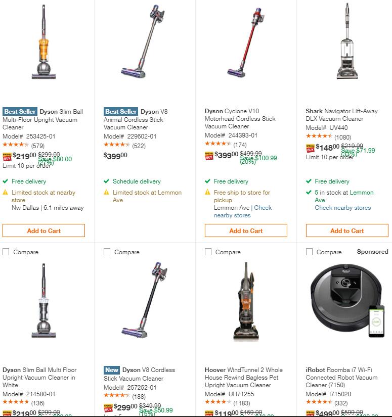 【网站简介】家得宝(The Home Depot, Inc.) 成立于1978年,是全球最大的家居装饰专业零售商,是排在沃尔玛、家乐福之后的全球第三大零售集团。家得宝遍布美国、加拿大、墨西哥和中国等地区,其产品种类超过30000个,在线购买所有家居装修需求:包括家用电器,浴室装饰理念,厨房改造,庭院家具,电动工具,烧烤架,地毯等。 Home Depot上的吸尘器、扫地机器人品牌众多,包括Dyson,Shark,Hoover,Eureka ,Dirt Devil,bObsweep, iRobot等各大品牌,部分折扣低至7折。