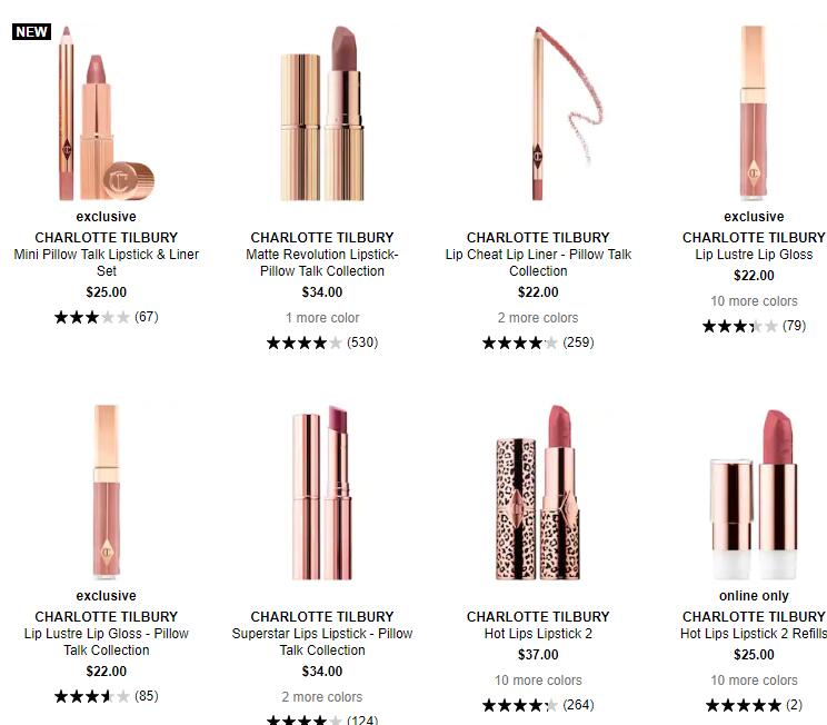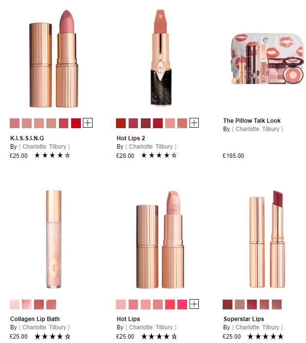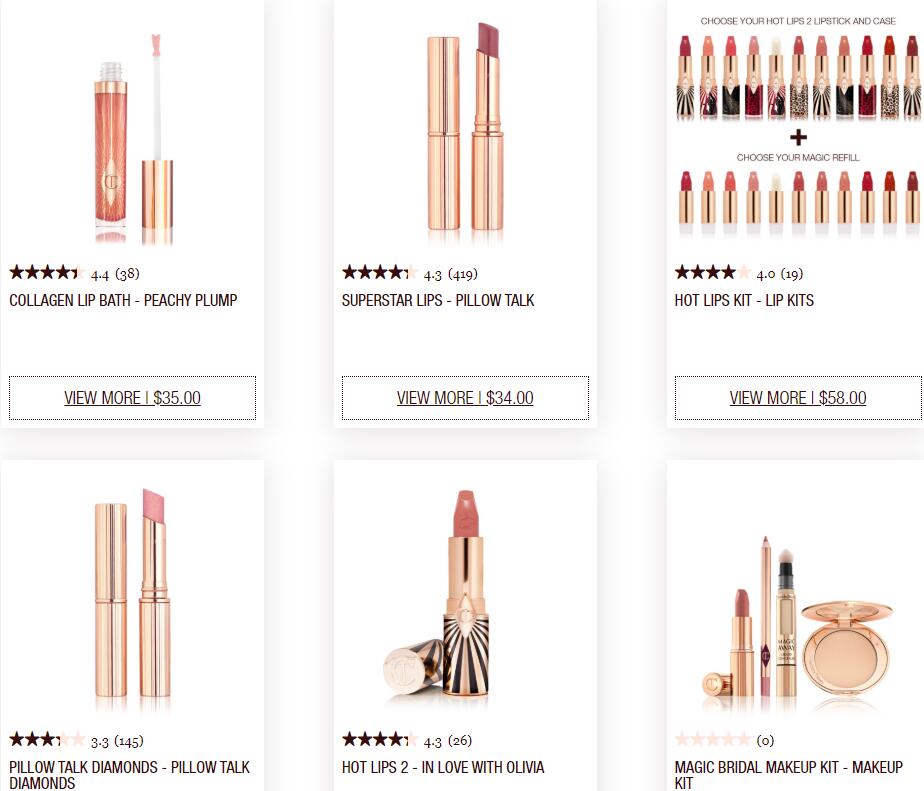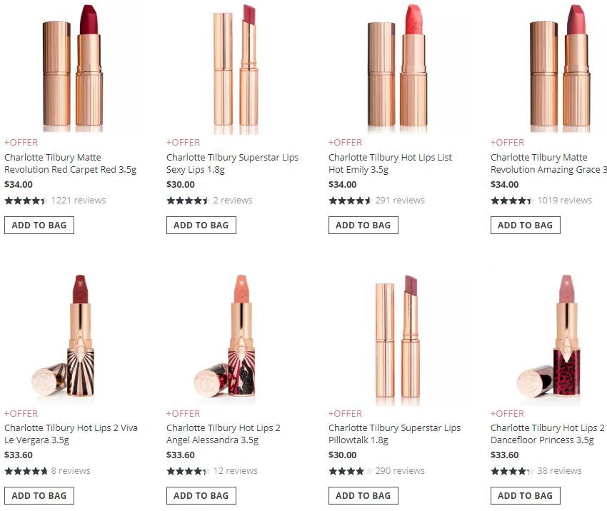 【网站简介】Cult Beauty是英国最大的美妆护肤综合网站之一,与其他网站不同的是,这个网站有用户的Blog可以让大家看到博主的使用心得。网站上除了常见的品牌以外,还有许多英文的本土品牌和小众品牌,大牌美妆品牌的产品色号一般比较全。Cult Beauty上的Charlotte Tilbury口红不算多,不过有些色号挺多的,可以慢慢挑下有没有自己想要的,还支持全球免邮。