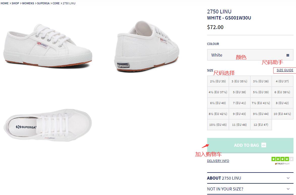 1) 注册完后就可进入商家页面购物了~~~挑选您想海淘的产品,以这双白色2750 LINU帆布鞋为例,加入购物车