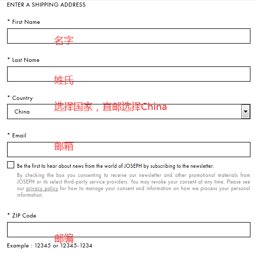 上面是个人信息,下面是地址,在国家那一项,转运,就选择英国,然后这里的地址要填转运公司所给的英国保税仓地址。如果想要直邮中国,应该把购物页面切换到China。