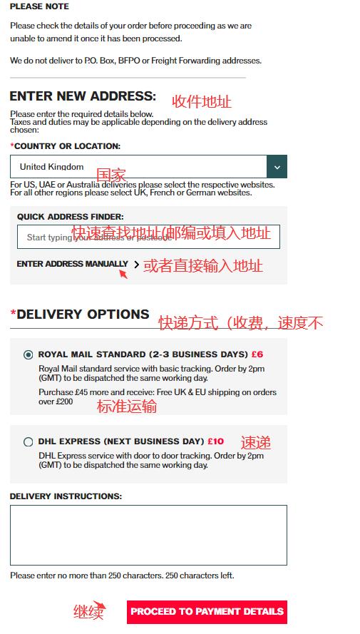 1)填写收件地址信息,即转运公司提供给你的转运地址信息(后文有详细的转运教程)& 选择快递方式
