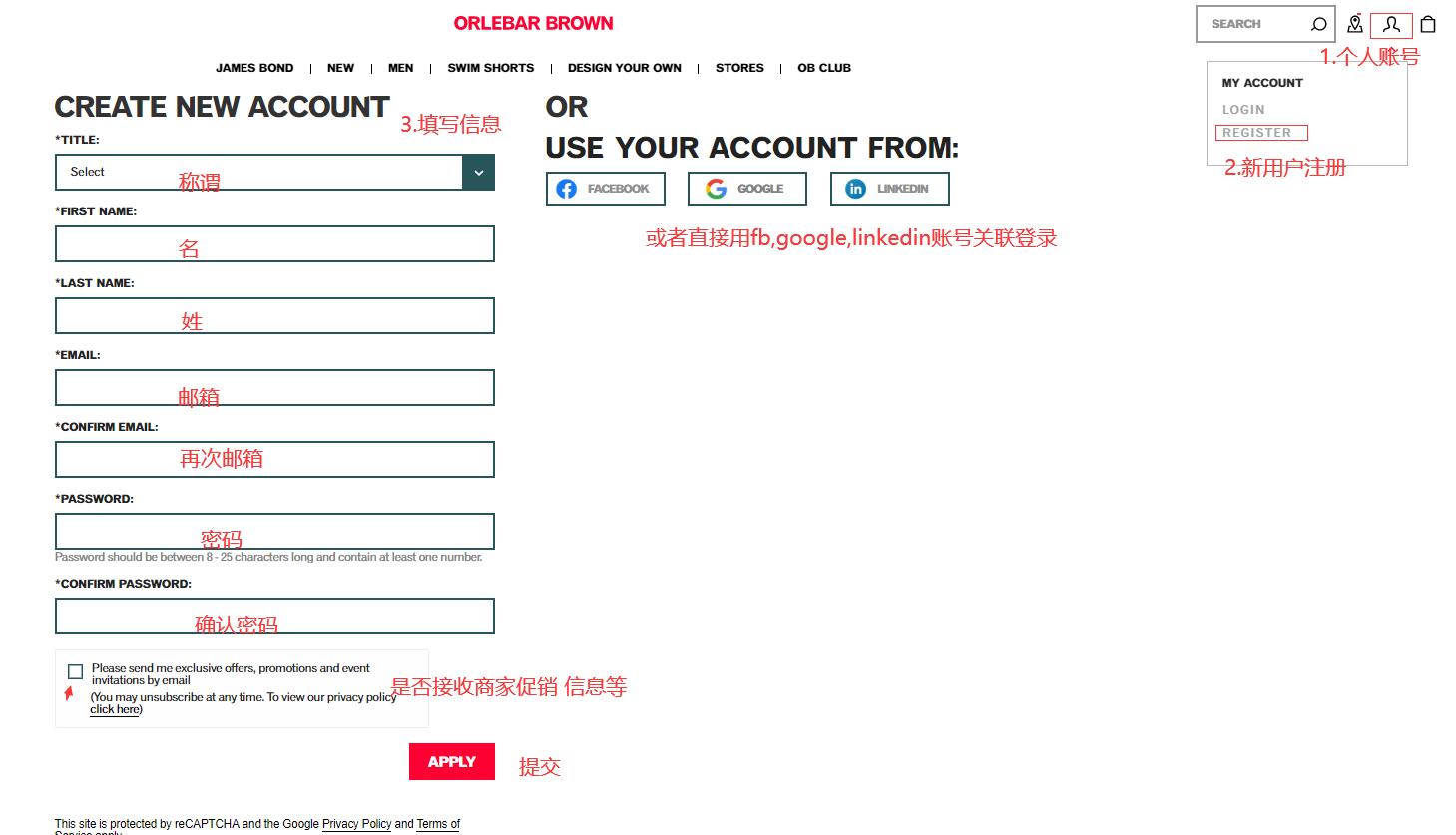步骤1:打开Orlebar Brown英国官网并注册账号
