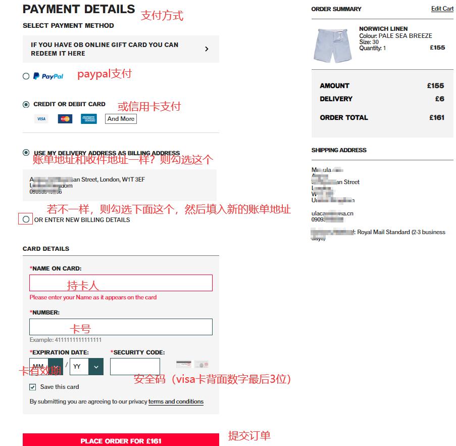步骤3:结账( 选择快递、确认收件地址信息、信用卡账单地址信息填写、选择付款方式)