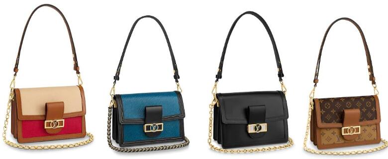 Dauphine手袋的款式和颜色选择非常多,也有腰包款Bumbag。材质上有经典的老花Monogram帆布和Monogram Reverse的组合,经典Epi 皮革,Lugano小牛皮,双色刺绣呈现粗花呢,羊毛粗花呢,以及双色全粒面Taurillon皮革等多种花色和面料。