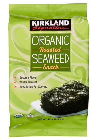 科克兰盐烤有机海苔市芝麻味的,是精选于韩国西海岸忠清南道沿海,经USDA认证的有机海苔,所以营养丰富,是补锌补碘好搭档,。它的一袋里只包含20卡路里,所以是低卡好零食啦!