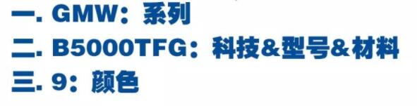 G-SHOCK把数显表统称为 DW(Digital Watch),把针显表统称为 AW(Analog Watch),那时型号的开头就只有这两种。所有的产品系列,都遵循同一套命名体系,由3个部分构成,例如大家都很熟悉的金方块,它的全名叫做GMW-B5000TFG-9,这里的GMW、B5000TFG、9 分别代表了系列,科技+型号+材料,颜色。