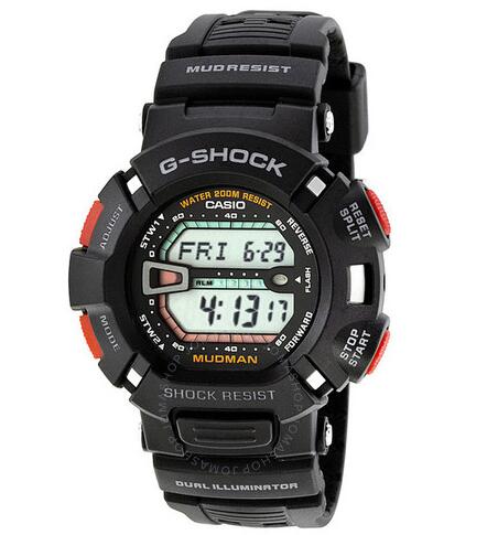 G-Shock G-9000是卡西欧G-SHOCK著名的泥人系列,外观硬朗,专为热爱机车运动人士所设计开发的,防泥构造杜绝了一切来自油污环境以及充满沙尘的汽车拉力比赛的侵蚀。是经久不衰的经典款 。G-9000-1V延用了G-Shock系列的经典黑酷外观,提供很强的抗震耐摔性。采用双显电子荧光照明;全自动背光;秒表(精确到0.01秒);倒计时;多功能闹铃;间歇响报;全自动日历;12/24小时制;防低温(零下20度);按钮声音开关。