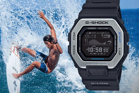 G-SHOCK专为专为极限运动场景而设计的运动系列,已经根据预期的环境开发了各种模型,如冲浪和滑雪板。该系列产品能显示冲浪者所需的信息,并可使用蓝牙连接手机应用,轻松的在全球约3300个地点中进行选择。