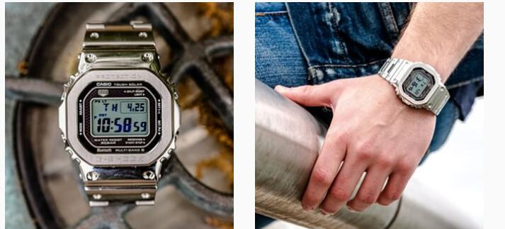 Full Metal 5000全金属银方块是一款全新的,精心制作的全金属钟表, 商务休闲百搭款。 受到首款G-SHOCK型号DW5000C的启发,这款升级的原版拥有现代光泽的色彩,同时又保留了复古美感。 采用了首个也是最具标志性的G-SHOCK表壳设计之一,具有复古方形表壳和表圈,表盘饰有砖纹。 GMWB5000D-1集成了超级照明器LED灯和太阳能电池,使其具有自充电功能,以及特殊的STN LCD。 此外,该时计还集成了升级的时尚全不锈钢外壳和DLC旋入式表壳。通过蓝牙连接和G-SHOCK应用程序以及G-SHOCK的Multi-Band 6 Atomic Timekeeper技术,可以实现双向时间同步,该技术可以通过来自世界各地多达6个不同发射器的无线电信号在几乎任何地方提供精确的计时。