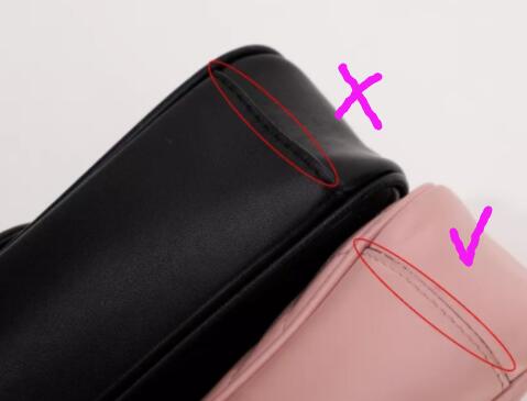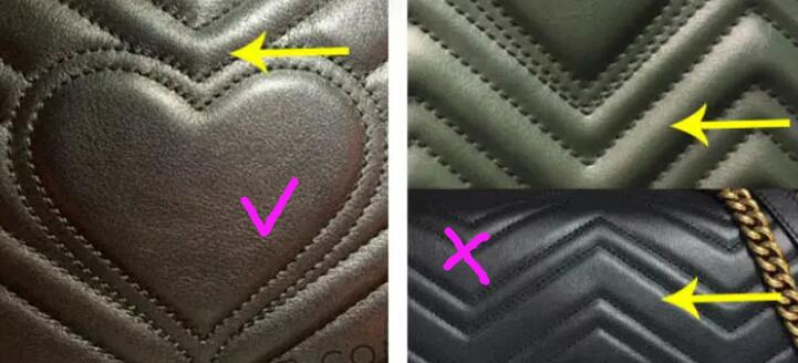 正品Gucci Marmon包上的之字形更锐利,更细且数量更多;而假货的之字形尺寸较大,边缘带有圆角。除了之字形,下面显示的纹路也不同,正品没有那么弯曲,此外针孔也应该被隐藏。正品的皮质更加哑光,而且没有假货那么臃肿。