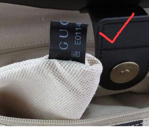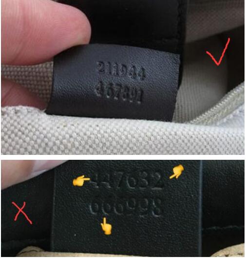 1)内侧皮标的背面有Gucci手袋的序列号,序列号的排列方式多有不同,最常见的是上下两行排列。数字都是6位,上排代表了款号,下排则是古驰内部的一个代码,通过这个代码能够查询到包包的制作地,制作工坊等信息;假货内衬标签上的字体和正品不同,而且可能较为模糊,标签背面也没有编号,有的精仿也会有编号,但是不会跟正品编号一样清晰的。