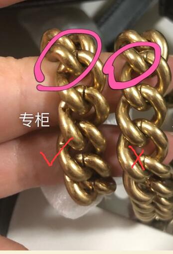 1)正品链条颜色是镀金的做旧金属,颜色较深,泛厚重的金属光泽,圈环连接处发黑;假货是喷漆,颜色金黄闪亮,圈环连接处细小缝隙,无做旧发黑;重量:正品链条金属感明显,较重;假货有明显的塑料感,手感较轻。