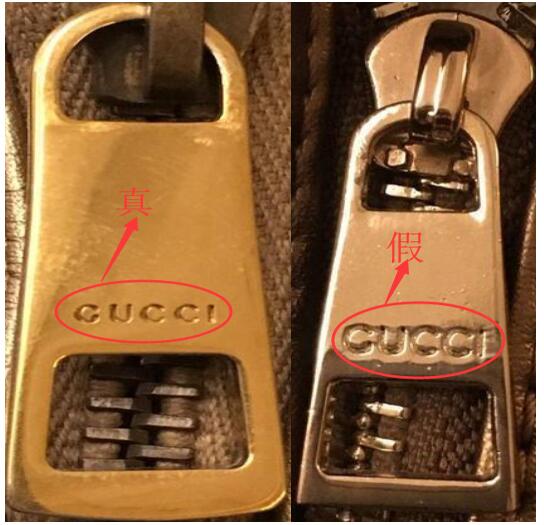 正品拉链背面有Gucci Logo标志,字体小而工整,logo清晰,镀层均匀且光泽饱满;仿品水波光泽强,字体粗大,质感差。虽然看起来很光亮,但容易刮花,且表面有拉丝,刻字不均匀,镀层偏薄色泽也不正。