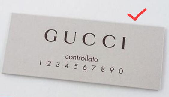 正品Gucci包会附带一个检查卡,上面写着GUCCI,下面用稍小一些的字写着Controllato,这个单词是意大利文“检查”的意思。下方数字写着1234567890。这个卡存在意义是告诉买主这个包是经过检测才上市的,质量合格。